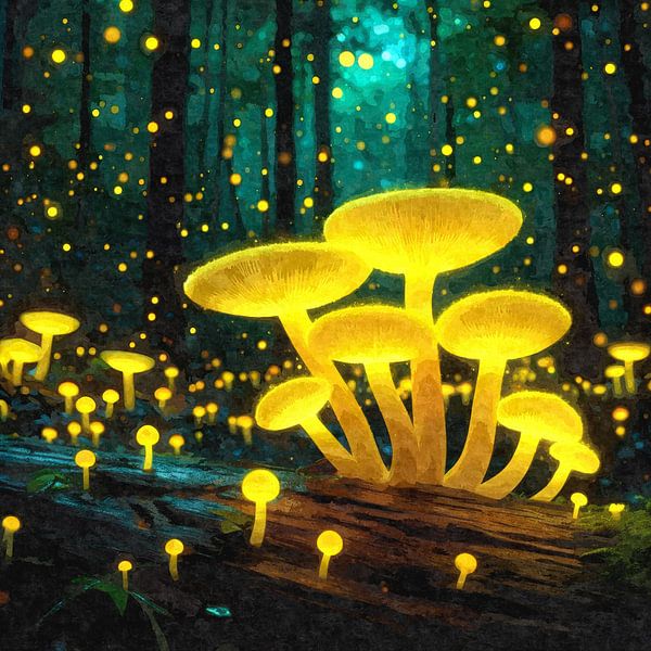 Leuchtende gelbe Pilze erhellen den dunklen Wald und schaffen eine magische Szenerie voller Geheimnisse. Die warmen Lichtakzente und die glühenden Partikel im Hintergrund erzeugen eine märchenhafte Stimmung.