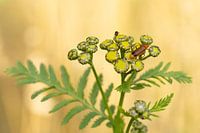 In einem Meer aus sanftem Gold ruht ein rotbraunes Insekt auf Rainfarn. Der kleine rote Wochenkäfer sitzt still da, doch plötzlich taucht ein Eindringling auf.