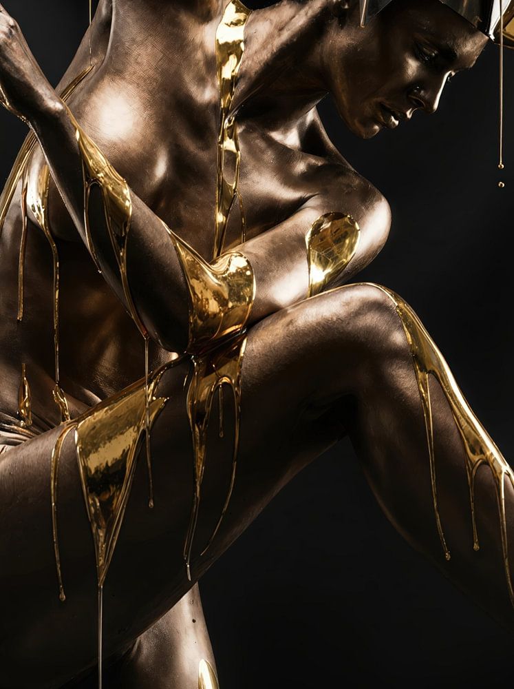 Diese Figur scheint nicht zu posieren, sondern sich selbst zu formen. Der Körper ist in Bewegung eingefroren, gespannt zwischen Kraft und Kontrolle, zwischen Aufstieg und Nachgeben. Gold fließt über Haut wie ein sichtbarer Gedanke – nicht dekorativ, sondern zwingend, als wäre es das Material, aus dem Wille gemacht ist.