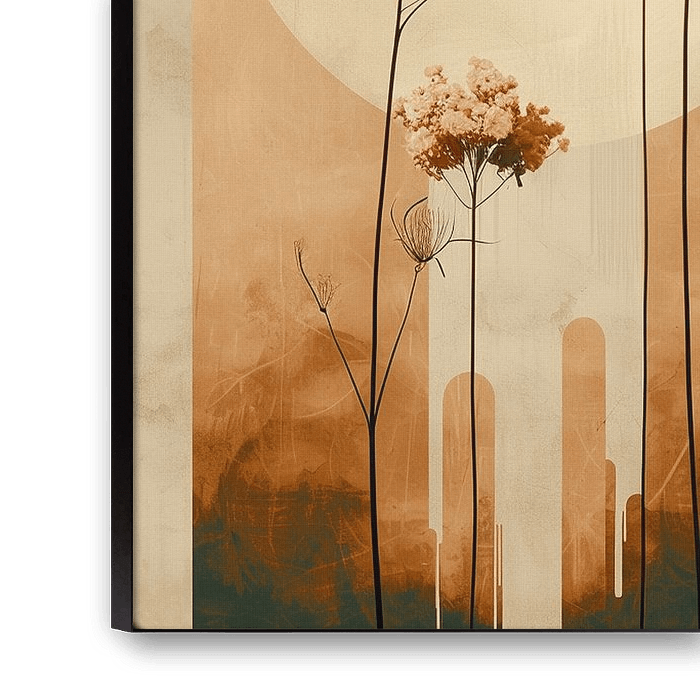 Eine heitere Japandi-Landschaft, in der sich hohe Blumensilhouetten vor einer sanften Sonne abheben. Die Komposition ist einfach, aber kraftvoll - wie ein Moment der Stille in warmen Erd- und Sandtönen. Ein perfektes Gleichgewicht zwischen Natur, Stille und Minimalismus.