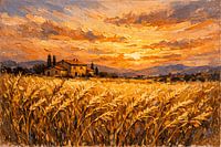 Ein warmes und einladendes Ölgemälde eines goldenen Weizenfeldes in der mediterranen Landschaft bei Sonnenuntergang. Reife Weizenhalme wiegen sich sanft in der warmen Brise, ein rustikales Bauernhäuschen aus Stein mit Terrakottadach liegt im Mittelgrund, und sanfte Hügel erstrecken sich bis zum Horizont. Der dramatische…