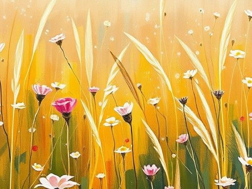 Dieses lebendige Gemälde fängt die Essenz einer ruhigen, in warmes, goldenes Licht getauchten Wiese ein. Zarte Wildblumen in Weiß- und Rosatönen sowie Rot- und Gelbtönen erheben sich aus einem üppigen, malerischen Vordergrund aus Grün- und Tiefblautönen. Hohe, elegante Weizen- oder Grashalme ragen hervor und verstärken den Eindruck von Tiefe und natürlicher Schönheit. Im dunstigen Hintergrund suggeriert ein subtiles Stadtbild eine friedliche Koexistenz zwischen Natur und städtischem Leben. Die impressionistischen Pinselstriche evozieren ein Gefühl der Ruhe und der flüchtigen Schönheit eines Sommertages.
