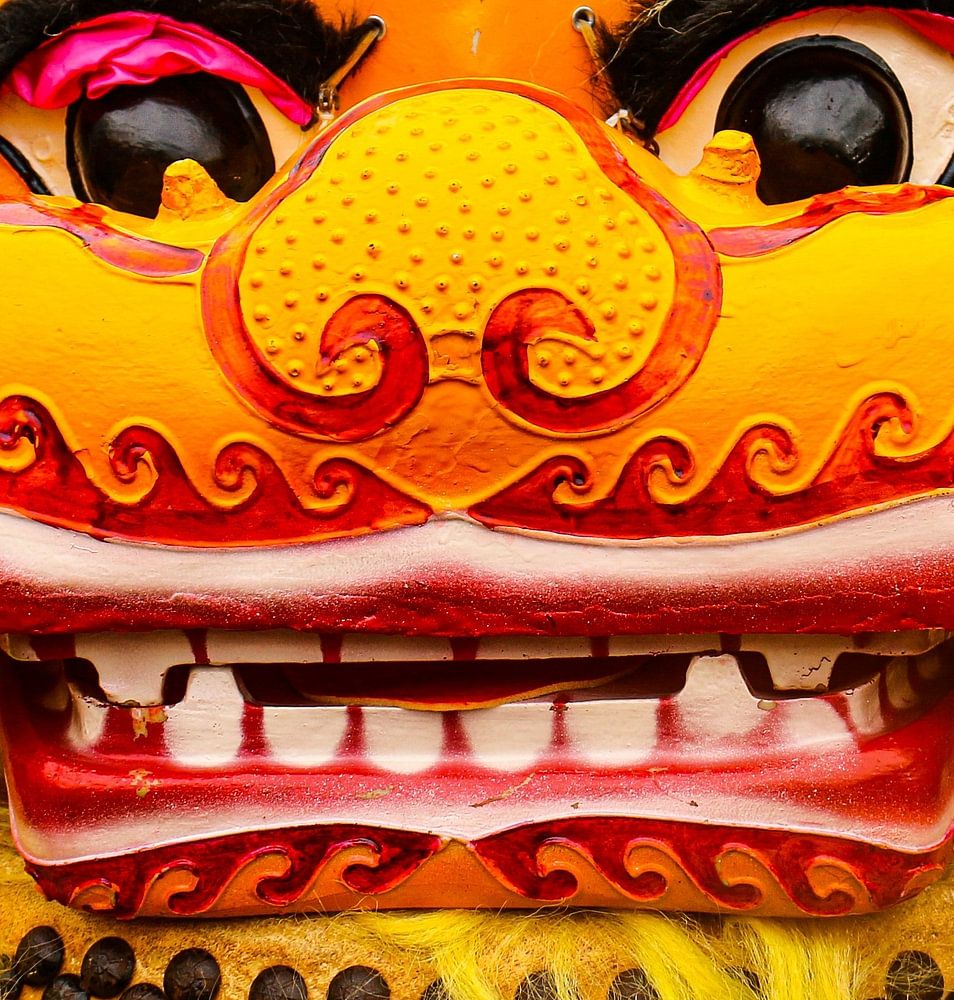 Goldene chinesische Löwendrachenmaske auf einem Fest zum chinesischen Neujahr in George Town, Penang, Malaysia am 2. Februar 2020