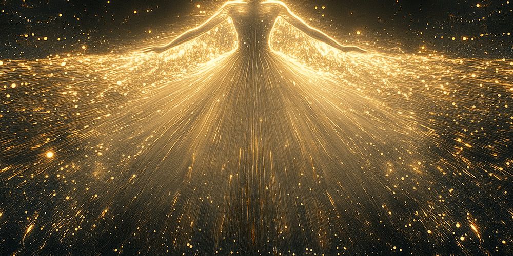 Dieses Kunstwerk strahlt eine fast göttliche Energie aus, ein brillantes Zusammenspiel von Licht und Bewegung, das die Essenz der Transzendenz einfängt. In einem unendlich dunklen Universum schwebt eine ätherische Gestalt, umhüllt von einem funkelnden, goldenen Glanz, der sich wie eine leuchtende Aura ins Unendliche erstreckt. Die Form erinnert an eine Tänzerin, ihre Arme anmutig ausgebreitet wie Flügel aus reinem Licht, ihr Kleid ein kosmischer Teppich aus Sternschnuppen und nebligem Glitzern.