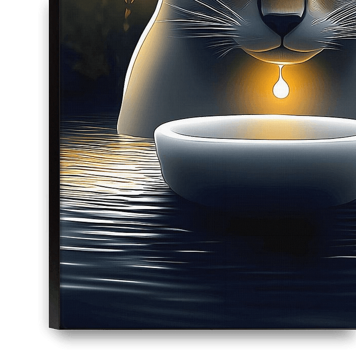 Eine himmlische Katze taucht zur goldenen Stunde auf, ihre glühenden Augen sind auf einen ätherischen Tropfen flüssigen Goldes gerichtet. In einer surrealen Traumwelt schwebend, steht dieses Kunstwerk für Mysterium, Göttlichkeit und das empfindliche Gleichgewicht zwischen Macht und Ruhe. Die Katze, die oft als Symbol für Intuition und…