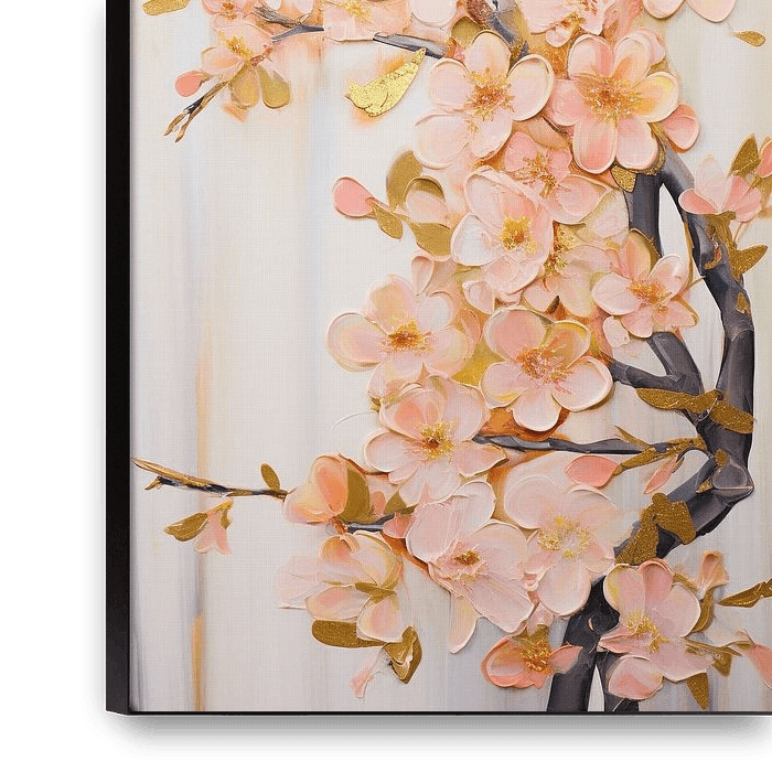 Goldener Frühling - Dieses Gemälde zeigt eine anmutige Darstellung von blühenden Zweigen, wahrscheinlich Kirschblüten, mit ihren zarten, rosa Blütenblättern. Die Textur und das goldene Blattwerk verleihen dem Bild Tiefe und ein luxuriöses Gefühl, während der subtile Hintergrund diese florale Schönheit noch unterstreicht. Der Stil ist…