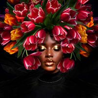 Eine kraftvolle, künstlerische Komposition: das Gesicht einer Frau mit einem tiefen, gleichmäßigen Teint, geschlossenen Augen und auffälligem Make-up. Ihre Augenlider sind mit glänzendem goldenem Lidschatten bedeckt, und ihre Lippen haben ein metallisch-goldenes Finish, was ihr ein luxuriöses und fast skulpturales Aussehen…