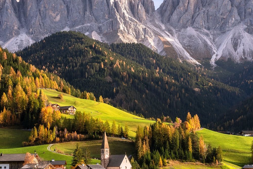 Die spektakulären Geislerspitzen thronen über dem herbstlichen und idyllischen Villnösstal (Val di Funes) in Südtirol. Im Oktober. Die Dolomiten begeistern im Oktober mit goldenen Herbstfarben und Lärchen.