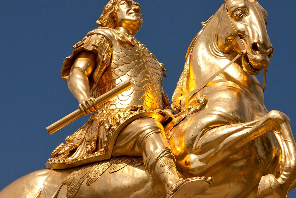 Goldener Reiter, Reiterstandbild des sächsischen Kurfürsten und polnischen Königs August des Starken auf dem Neustädter Markt in Dresden, Sachsen, Deutschland, Europa | The Goldener Reiter or Golden Rider, a gilded equestrian statue of Augustus the strong, Elector of Saxony and King of Poland in Dresden, Saxony, Germany, Europe