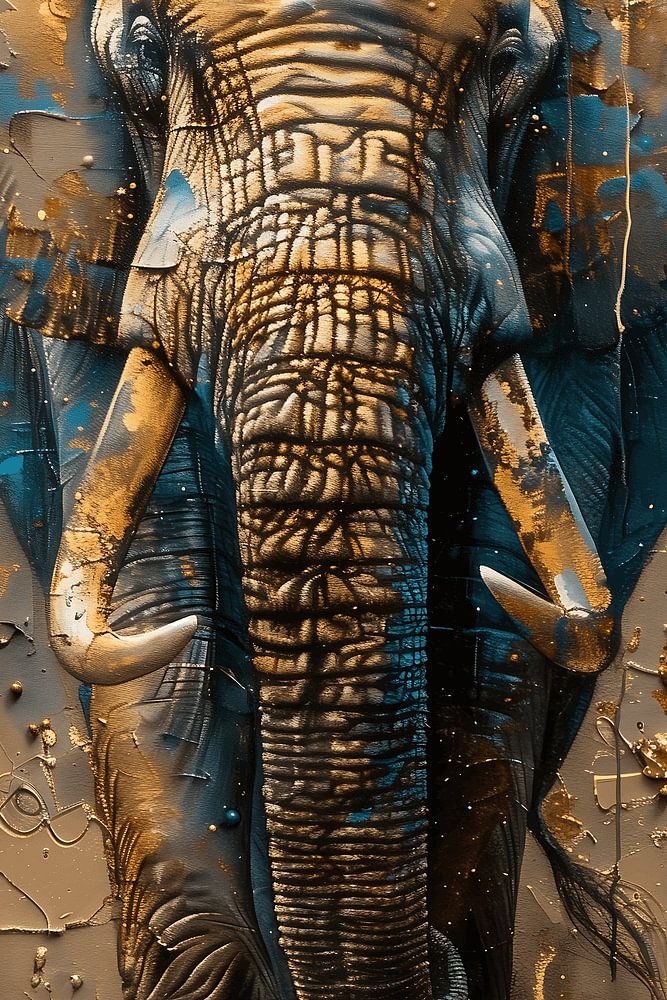 Ein ausdrucksstarkes und majestätisches Gemälde eines Elefanten in einer Mischung aus Realismus und Abstraktion. Der Elefant steht im Mittelpunkt einer Palette aus sanften, erdigen Grautönen, während der Hintergrund von leuchtenden, metallischen Goldspritzern und abstrakten Schwüngen geprägt ist. Die blauen Akzente setzen einen unerwarteten Kontrast und verleihen dem Werk einen modernen und dynamischen Charakter. Die schwere Textur der Farbe unterstreicht die Stärke und die beeindruckende Erscheinung des Tieres. Dieses Kunstwerk ist ein kraftvolles Statement für jeden Raum und spricht Liebhaber einzigartiger Tierporträts an.