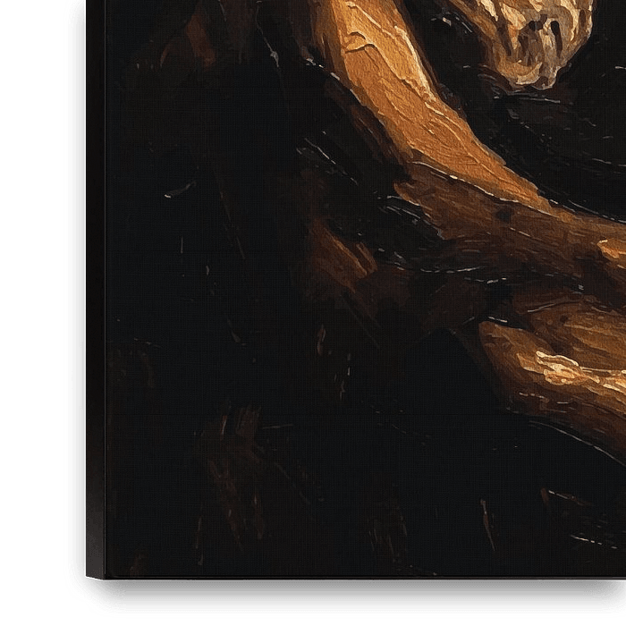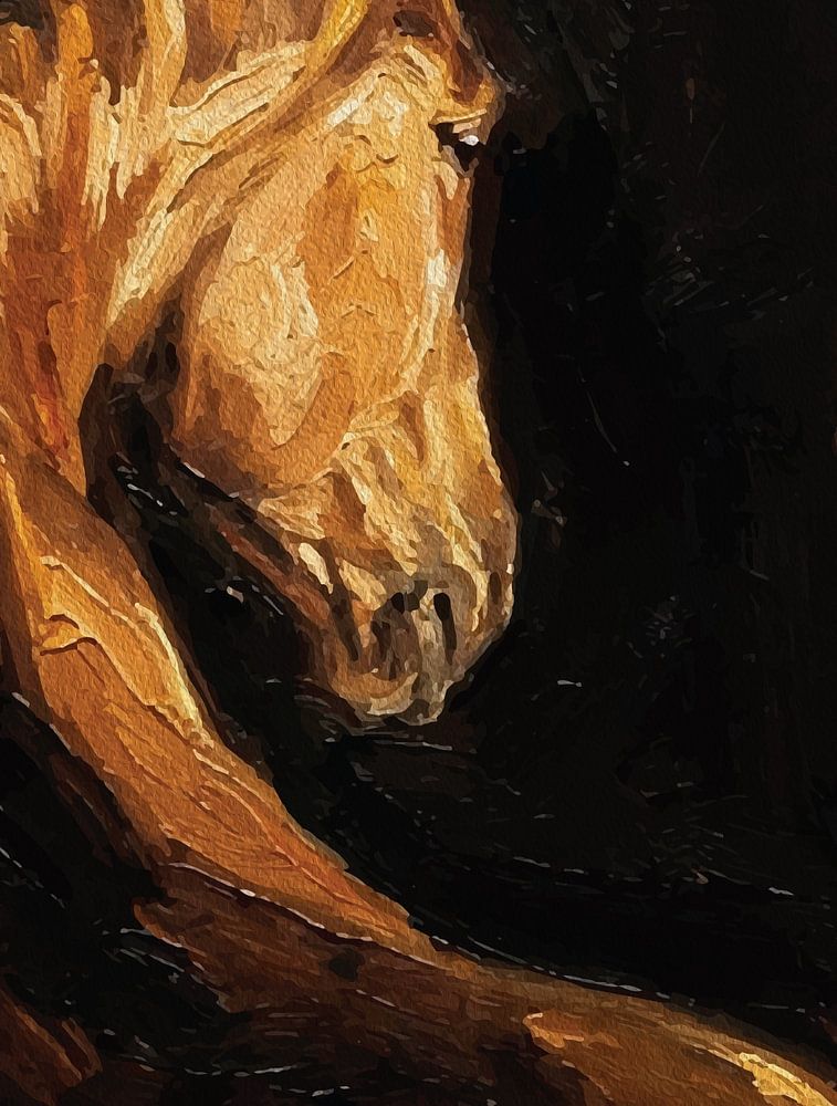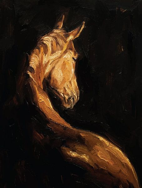 Ein ausdrucksstarkes Ölgemälde, das ein goldenes Pferd vor einem dunklen Hintergrund zeigt und Textur, Kontrast und Eleganz zu einer eindrucksvollen Wanddekoration vereint.