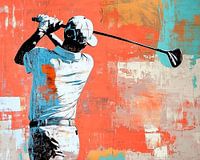 Golf gemälde | Mann mit Golfschläger - Dieses Golfgemälde zeigt einen Mann in sportlicher Pose mit einem Golfschläger vor einem Hintergrund aus warmen Farben wie Orange und Türkis, was dem ganzen Bild einen dynamischen Look verleiht.