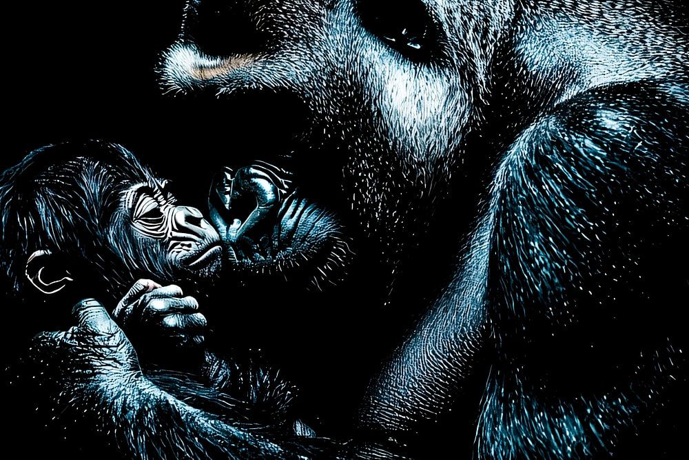 Dieses Design fängt einen beeindruckenden Moment der Zärtlichkeit zwischen einem Gorilla und einem Baby ein. Die kraftvolle, detaillierte Darstellung des Gorillas verbindet Schutz und Liebe. Die leuchtenden Blau- und Grautöne bringen die Stärke und Sanftheit der beiden Kreaturen zum Ausdruck. Die Konzentration auf die Augen und die Berührung machen es zu einer berührenden und dynamischen Darstellung der Bindung zwischen Eltern und Kind in der Tierwelt. Dieses digitale Kunstwerk weckt nicht nur Emotionen, sondern unterstreicht auch die tiefe Verbindung, die zwischen Tieren besteht. Perfekt für einen modernen Raum, der eine Botschaft der Fürsorge und Liebe vermitteln möchte.