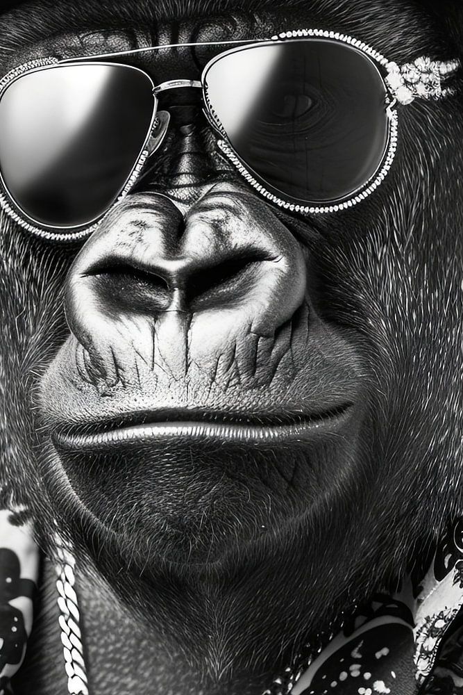 Ein Porträt eines modisch gekleideten Gorillas in schwarz-weiß. Er trägt eine Sonnenbrille, einen Hut und ein gemustertes Hemd.