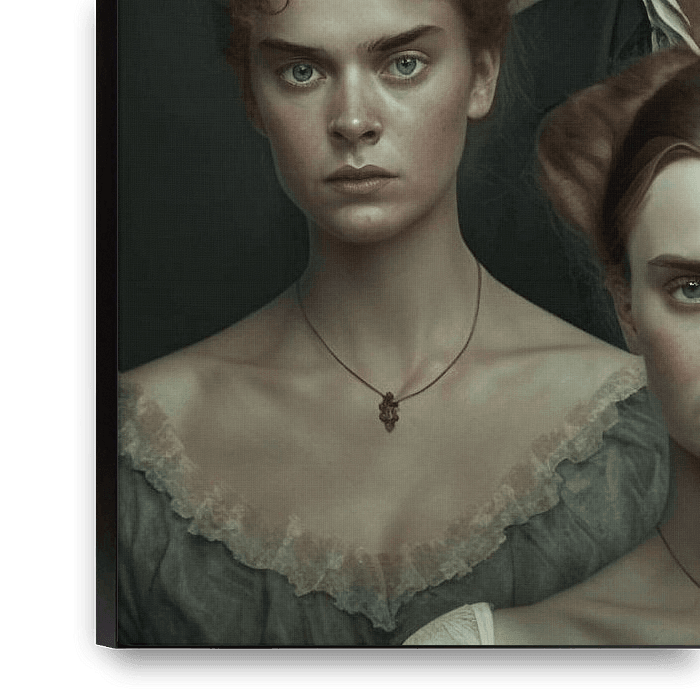 Ein eindringliches Porträt eines grüblerischen Mannes und fünf feierlich gekleideter Frauen in historischer Kleidung. Ihre blassen Gesichter, scharfen Züge und durchdringenden Blicke schaffen eine auffallend unheimliche, gotische Atmosphäre. Die gedämpfte Beleuchtung und die gedämpfte Farbpalette vermitteln ein Gefühl von Geheimnis,…