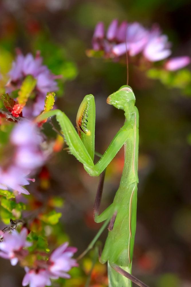 Gottesanbeterin im Sommer in einer Heidelandschaft