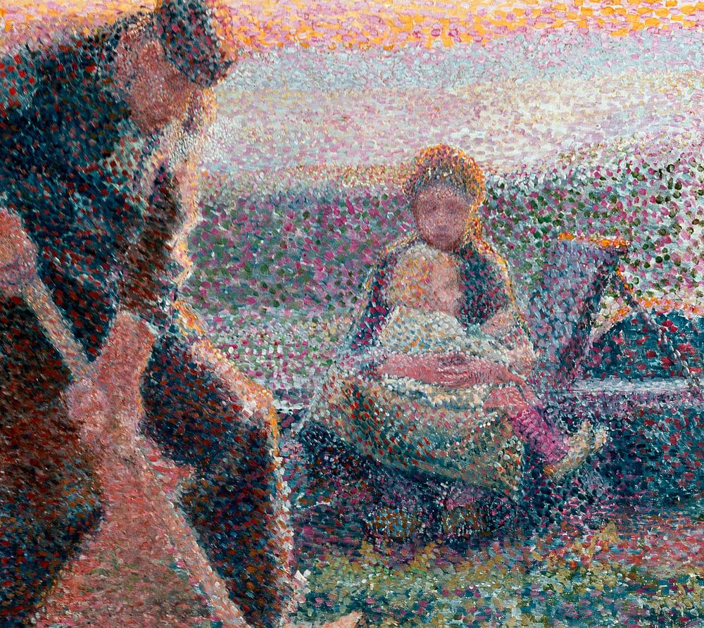 Pointillistisches Kunstwerk eines Bauern, der gräbt oder mit einer Schaufel (Spaten, Schaufel oder Spaten) gräbt. Seine Frau und seine Tochter beobachten die hölzerne Schubkarre auf dem Feld.