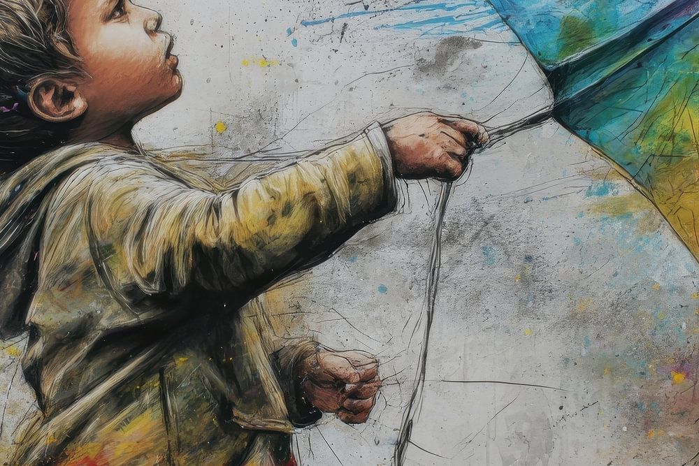 Ein Junge, der seinen bunten Drachen hält, eingefangen in einem Moment voller verträumter Energie. Der Kontrast zwischen dem monochromen Hintergrund und den Farbspritzern verleiht dem Werk eine spielerische, hoffnungsvolle Kraft - ideal für alle, die ihren Innenräumen einen Hauch von jugendlichem Optimismus verleihen wollen.