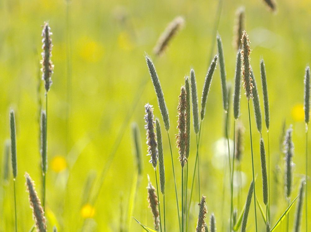 Wilde Gräser in verschiedenen Längen heben sich vom Grün und Gelb der Wiese ab.