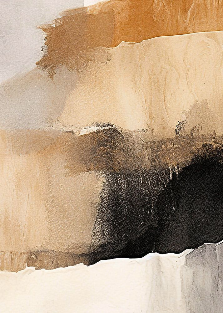 Die von der Farbfeldmalerei inspirierte Komposition spielt mit Farbschichten und subtilen Texturen. Dunkles Gold und Weiß akzentuieren die Nuancen des Ganzen, während helle Orange- und Grautöne einen Hauch von Lebendigkeit verleihen.