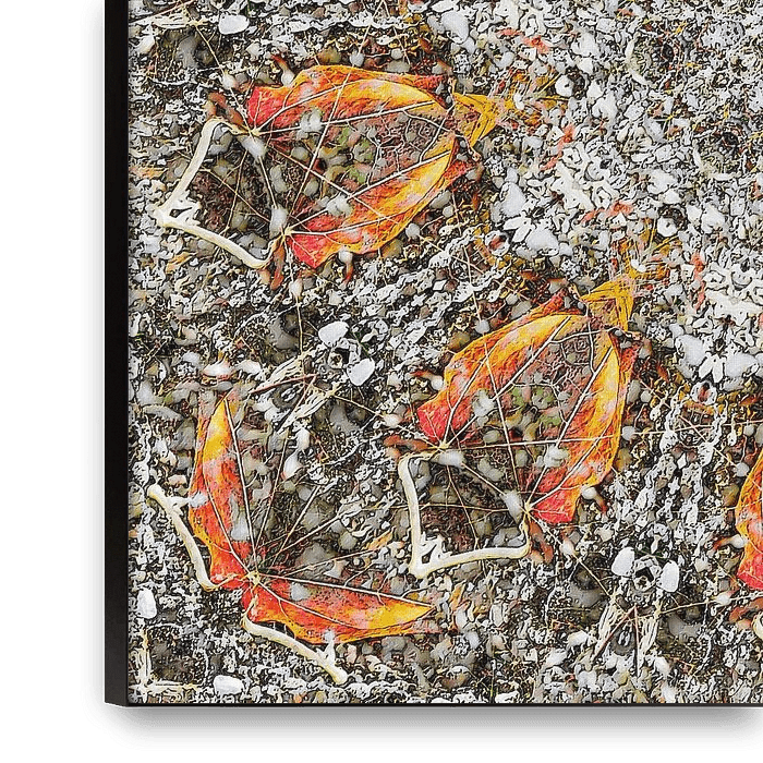 Ein kaleidoskopisches Bild in roten und weißen Tönen, mit einer Form irgendwo zwischen einem Kreis und einem Stern, basierend auf einem Foto eines gefallenen Blattes auf einer Kiesstraße im Herbst.