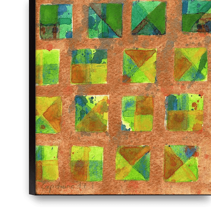 In this painterly pattern primarily green squares are placed regularly onto a golden background. The whole image is composed out of many layers of translucent watercolor. The main attraction are the mainly green squares which are divided diagonally, vertically and horizontally into different tones. An underlying layer of red and blue…