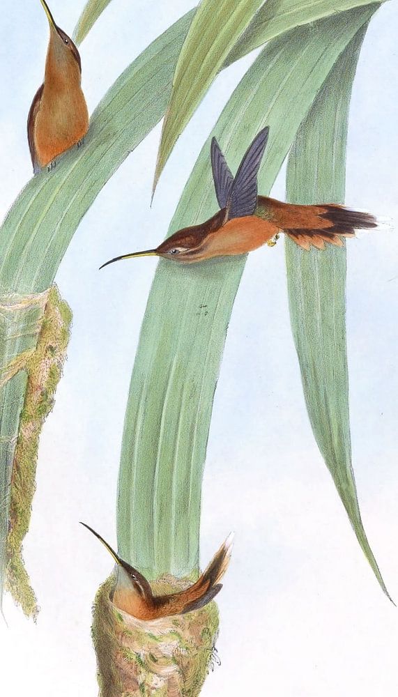 Grey-Throated Hermit (Phæthornis griseogularis), John Gould Es gibt allen Grund zu der Annahme, dass diese Art über alle gemäßigten Regionen Columbia und Ecuador verteilt ist: Ich habe sie häufig in Sammlungen von Bogota gesehen, und ich habe sie direkt von Quito von Professor Jameson geschickt, der 6000 Fuß als die gibt als die Höhe, in der sein Exemplar beschafft wurde; Es ist ein schöner Vertreter in diesen Regionen der P. eremita und P. pygmea von Brasilien: Es unterscheidet Grau statt Buff; Die beiden zentralen Schwanzfedern werden auch mit grauem Weiß anstelle von Buff gekippt, und die Wellen von Eremita und Pygmæa sind Buff, während sie in den gegenwärtigen Arten schwarz sind. Diese Illustration wurde in ihre ursprüngliche Lebendigkeit wiederhergestellt, indem die Farben verstärkt und unerwünschte Markierungen entfernt werden. Eine Monographie der Trochilidæ oder der Familie von Kolibris wurde zwischen 1849 und 1887 vom englischen Ornithologen John Gould veröffentlicht. Diese monumentale Arbeit zeigt und beschreibt alle bekannten Arten von Kolibris zu dieser Zeit - mit 418 lithografischen Platten und Informationen zu 537 Arten. "
