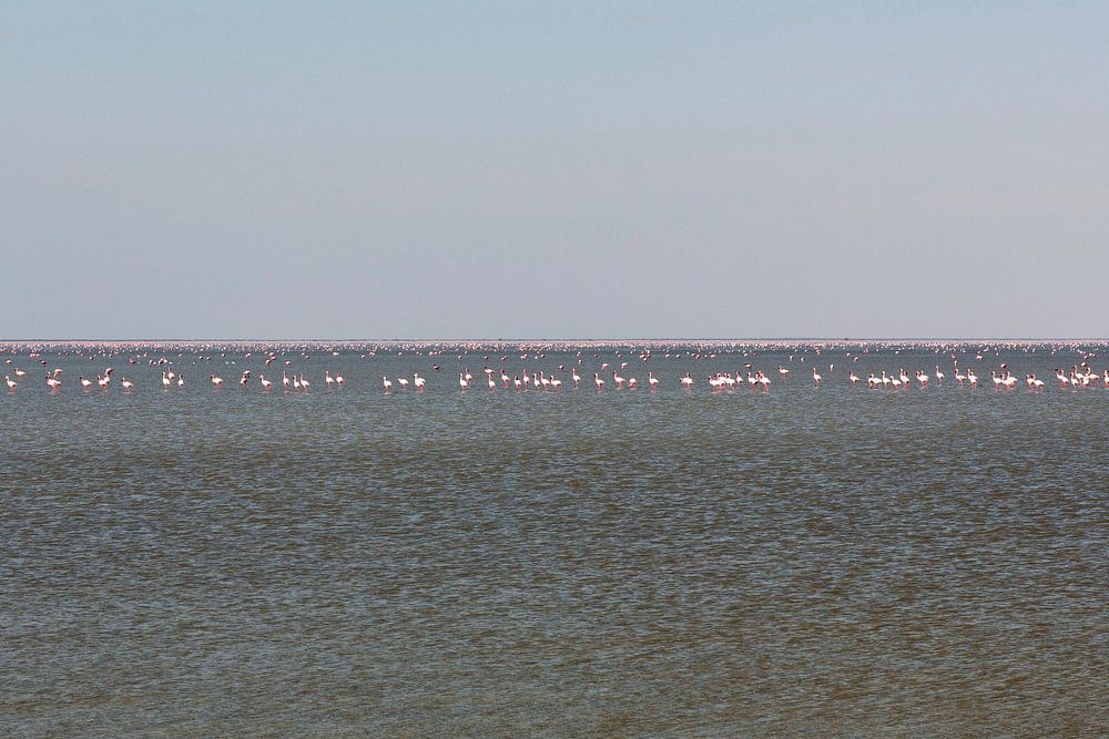 Größere und kleinere Flamingos in den Makgadikgadi-Pfannen in Botswana, Afrika.