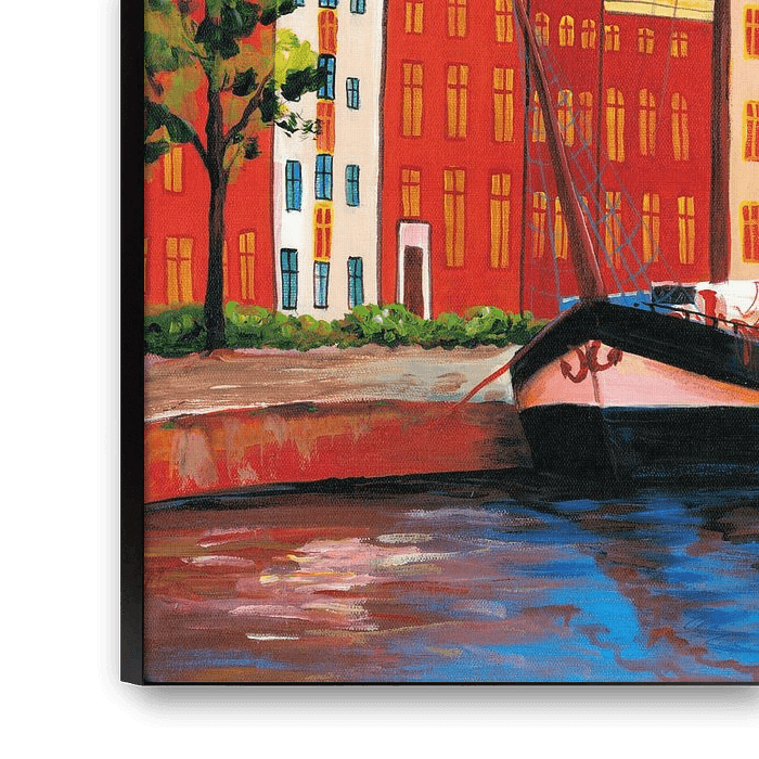 Buntes Stadtbild: Groningen mit Kirchturm des Der Aa-kerk. Hier sind Sie garantiert fröhlich! Die Pinselstriche sind auch beim Drucken auf Leinwand oder Aluminium deutlich sichtbar.