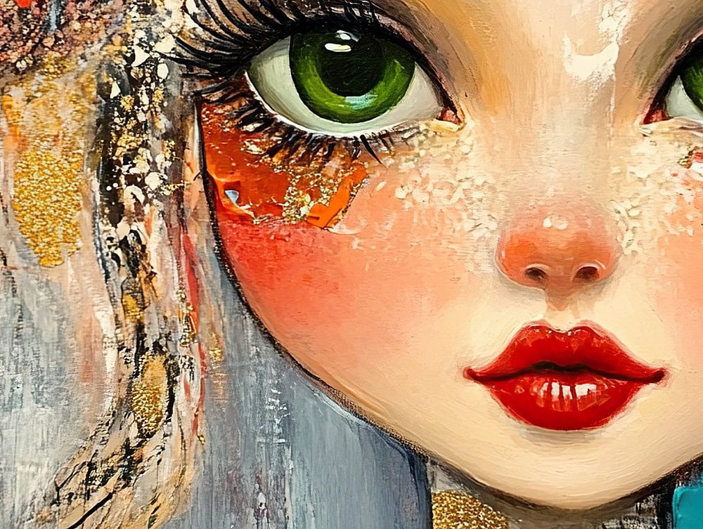 Big Eyes - Dieses Frauenbild zeigt ein Mädchen mit großen grünen Augen und einem fröhlichen Gesichtsausdruck, umgeben von bunten Blumen und einem Schmetterling, die eine verspielte und lebendige Atmosphäre schaffen.