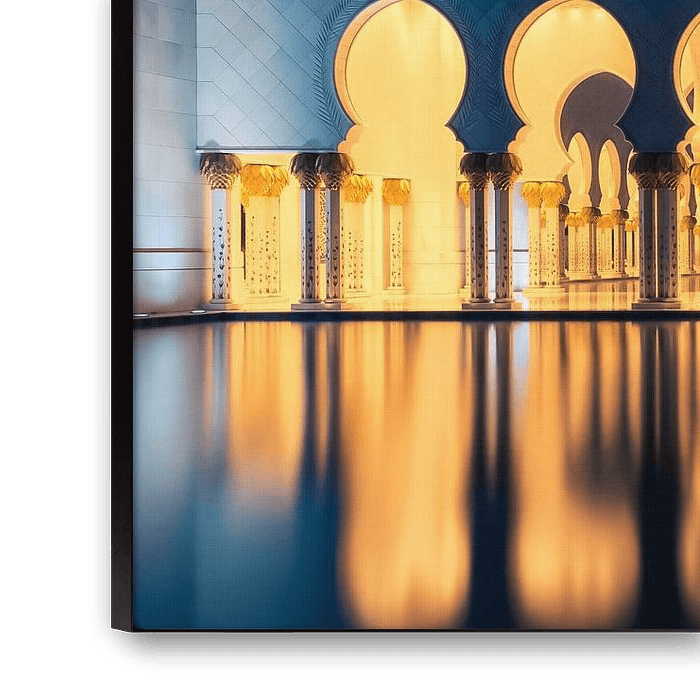 Die Große Sheikh-Zayed-Moschee in Abu Dhabi. Die Aufnahme entstand in der Nacht, als die Moschee schön beleuchtet war. Blau und Gelb passen hervorragend zu dieser fantastischen Moschee.