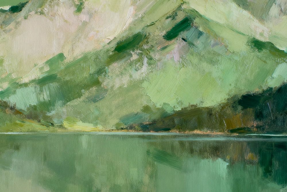 Eine moderne Landschaft als Malerei mit organischen Formen im Fluss der Ruhe und Gelassenheit. Von der Natur inspiriert zeigt sich diese Berglandschaft in wunderschönen sanften Grüntönen.