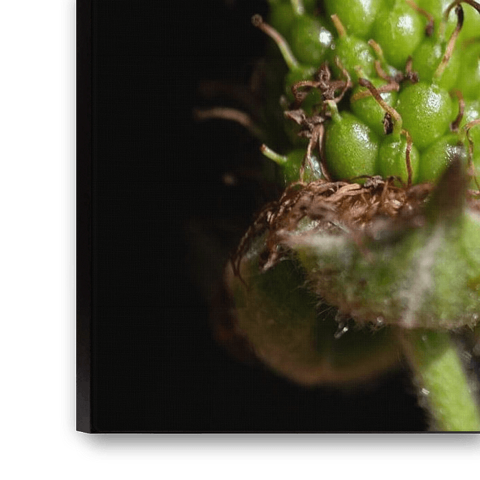 Drei grüne Brombeeren nebeneinander vor dunklem Hintergrund. Die Früchte sind noch nicht reif. Die Beeren sind klein und sind nebeneinander aufgereiht.