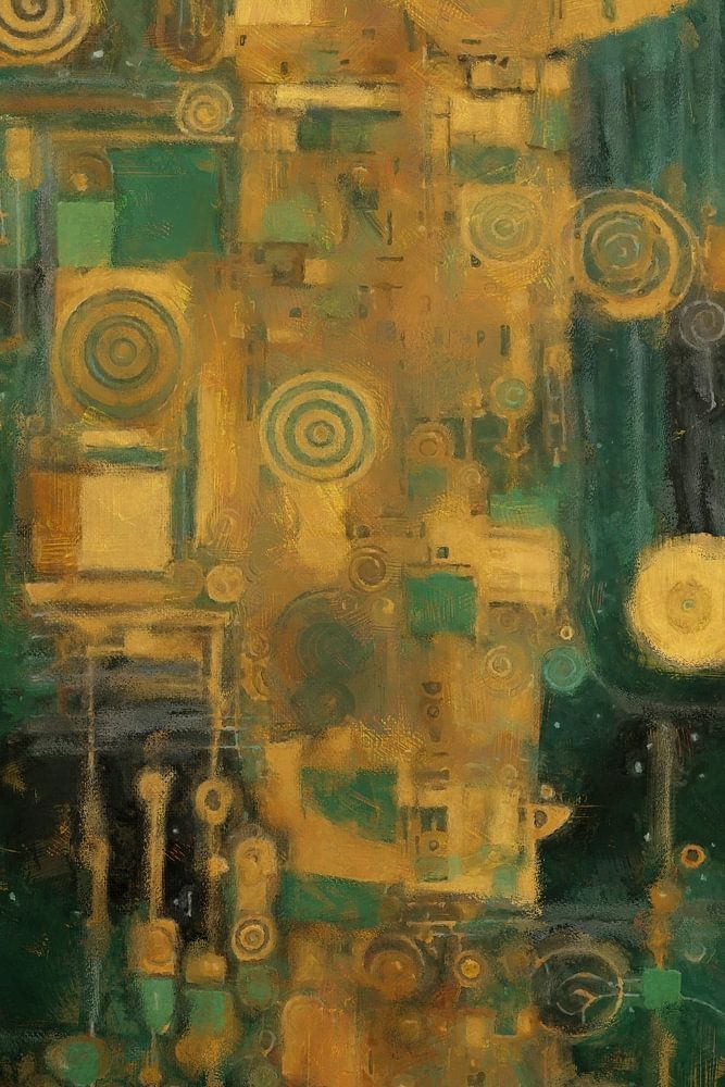 Dieses Werk zeigt eine faszinierende Kombination aus tiefen Grüntönen und subtilen Goldmustern. Die vertikale Struktur in der Mitte enthält mehrere kreisförmige und geometrische Elemente, die zusammen ein Gefühl von Bewegung und Tiefe erzeugen. Der Kontrast zwischen dem erdigen grünen Hintergrund und den warmen goldenen Details schafft ein angenehmes visuelles Gleichgewicht. Dieses Stück passt perfekt in einen modernen Raum und kann Ihrem Interieur ein beruhigendes und zugleich auffälliges Element hinzufügen.