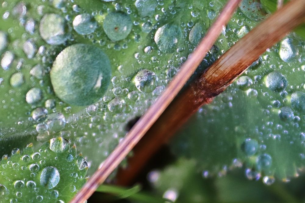 Grüne Pflanzen und Blätter mit frischen Regentropfen darauf