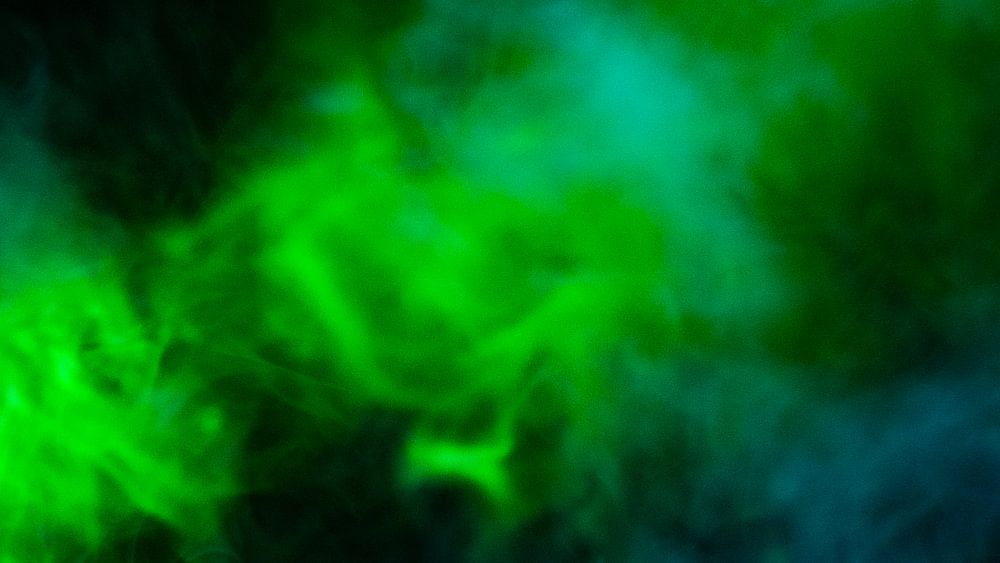 Abstraktes Foto von grün angezündetem Rauch und blauer Tönung darunter, vor schwarzem Hintergrund.
