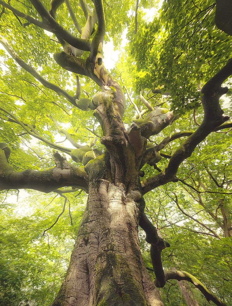 Grüne Hexenbuche im Frühling in Bladel, Niederlande. Der tolle Blickwinkel erweckt diese alte Buche wirklich zum Leben.