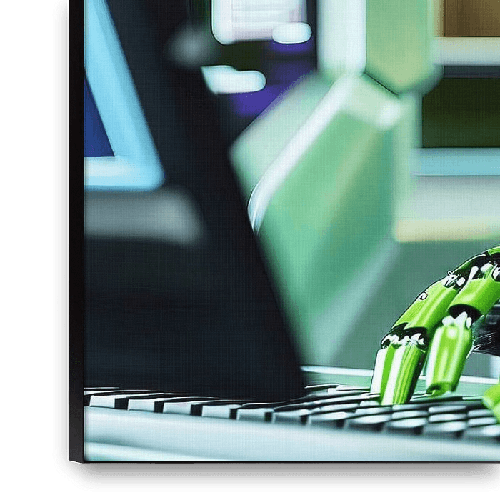 Bestelle diese Illustration Grüner Roboter am Computer von Frank Heinz als Reproduktion auf Leinwand, Alu-Dibond, als Poster, Fototapete oder Acrylglasbild.
