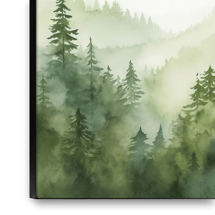 Dieses Aquarell zeigt eine weite Berglandschaft, die in die üppige Pracht endloser Lärchen getaucht ist.