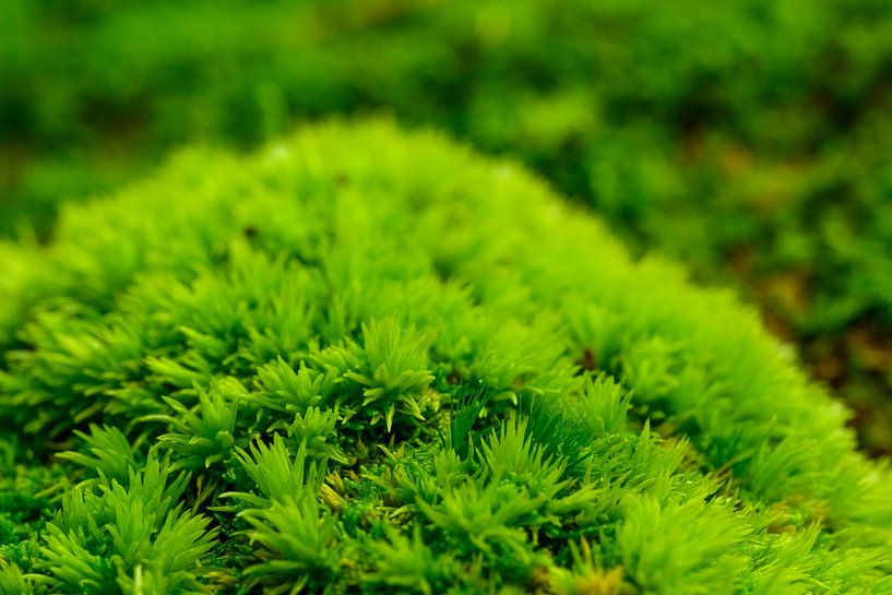 Frisches grünes Moos wächst auf dem Waldboden. Makrofotografie im Naturschutzgebiet Veluwe an einem Herbsttag.