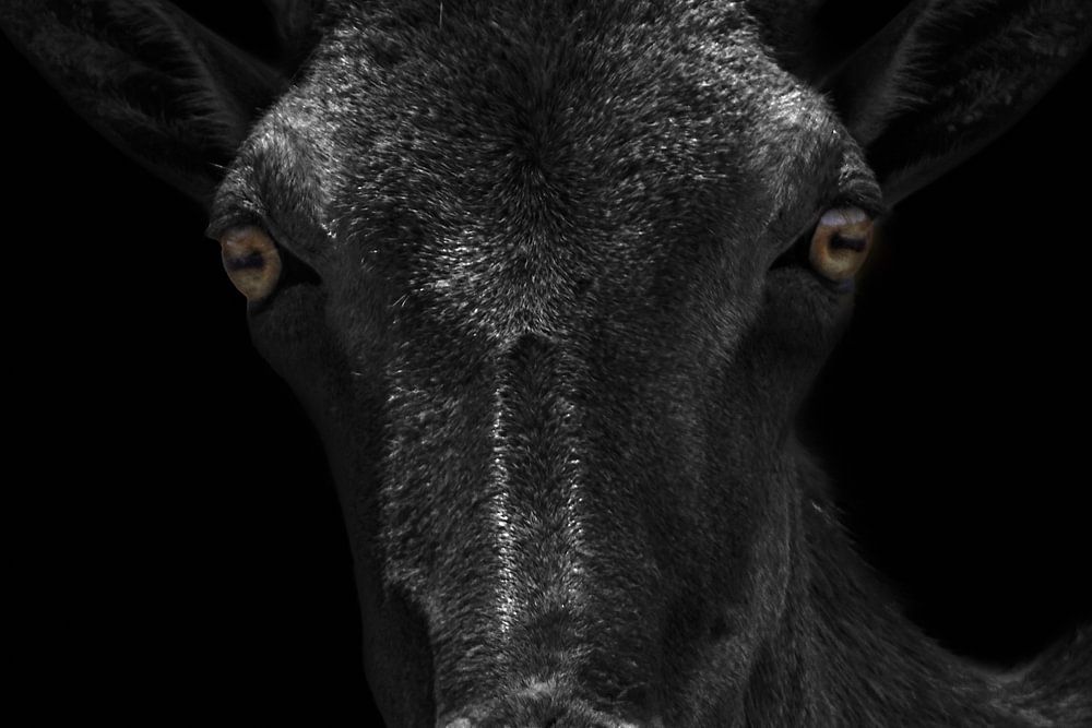 Nahaufnahme Porträt eines dunklen, gruseligen Steinbocks, der in die Kamera sieht. Freisteller auf schwarzem Hintergrund.