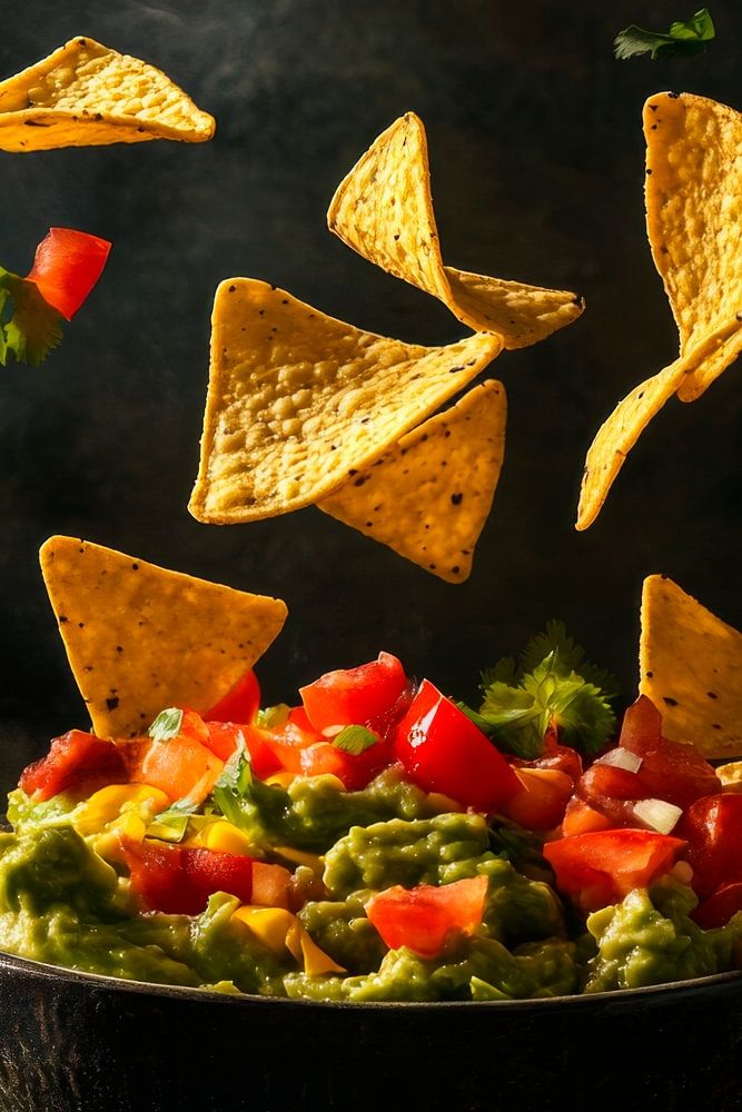 In einer dynamischen Szene feiern knusprige Tortilla-Chips mit frischen Tomaten und Limetten einen Gusto-Tanz. Die leuchtenden Farben von Guacamole und Gemüse verleihen diesem Kunstwerk eine einladende Frische. Perfekt für die Küche, bringt es die Freude am Kochen und Genießen in jeden Raum!