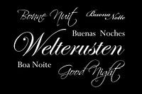 Gute Nacht, Bonne Nuit, gute Nacht. Die Hintergrundfarbe ist schwarz, die Buchstaben sind weiß. Text auf Leinwand oder anderem Material.