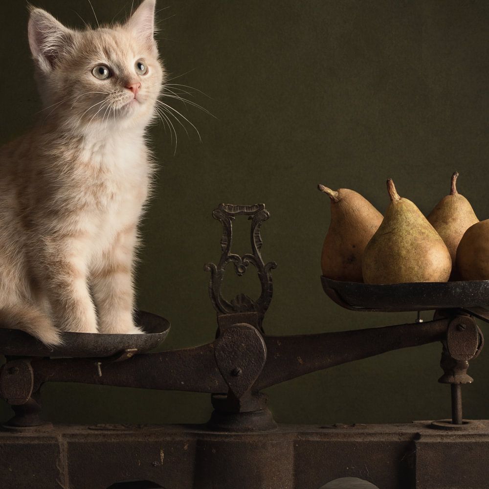Kätzchen Guus sitzt auf einer Birnenwaage