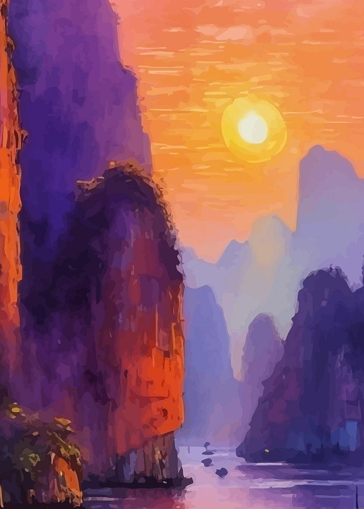 Diese abstrakte Landschaft in Ölpastell fängt die ruhige Majestät der Bucht von Ha Long in der Abenddämmerung ein, wo sich zerklüftete Kalksteintürme wie Wächter aus dem schimmernden Wasser erheben. Die malerischen Pinselstriche und strukturierten Übergänge erzeugen einen fast traumhaften Schleier, wobei die Hell-Dunkel-Kontraste das Gefühl der Stille verstärken, während die Sonne am Horizont glüht. Sanfte Spritzer und mehrschichtige Bewegungen erinnern an die Ebbe und Flut der Gezeiten und ziehen den Betrachter in eine ebenso mystische wie heitere Atmosphäre. Dieses Werk bietet mehr als nur eine Landschaft - es ist ein Fenster zur stillen Poesie der Natur, perfekt für Sammler, die ruhige und doch kraftvolle Bilder schätzen.