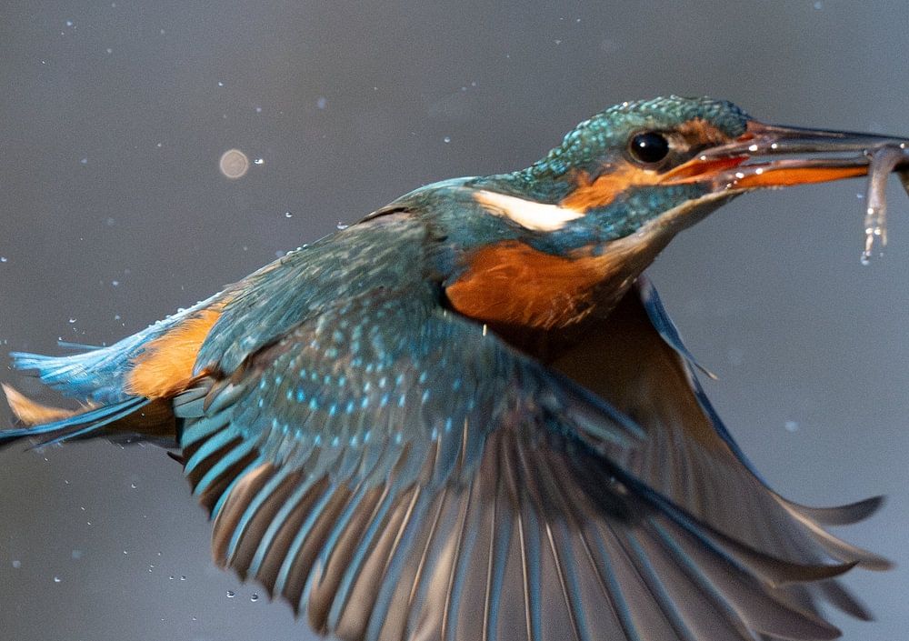 Ein schöner Eisvogel mit einem kleinen Fisch unmittelbar nach dem Auftauchen aus dem spritzenden Wasser.