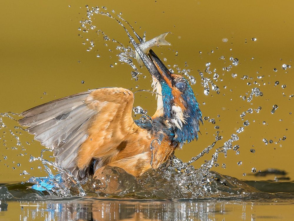 Der Eisvogel fotografierte den Moment, als er mit einem gefangenen Fisch aus dem Wasser kam. Beim Tauchen schließt der Eisvogel seine Augen mit einer Schutzmembran. Trotz der Membran kann er gerade noch unter Wasser schauen. Das Tauchen und Herauskommen aus dem Wasser erfolgt im Bruchteil einer Sekunde und ergibt mit diesem guten Timing ein schönes und dynamisches Action-Bild.
