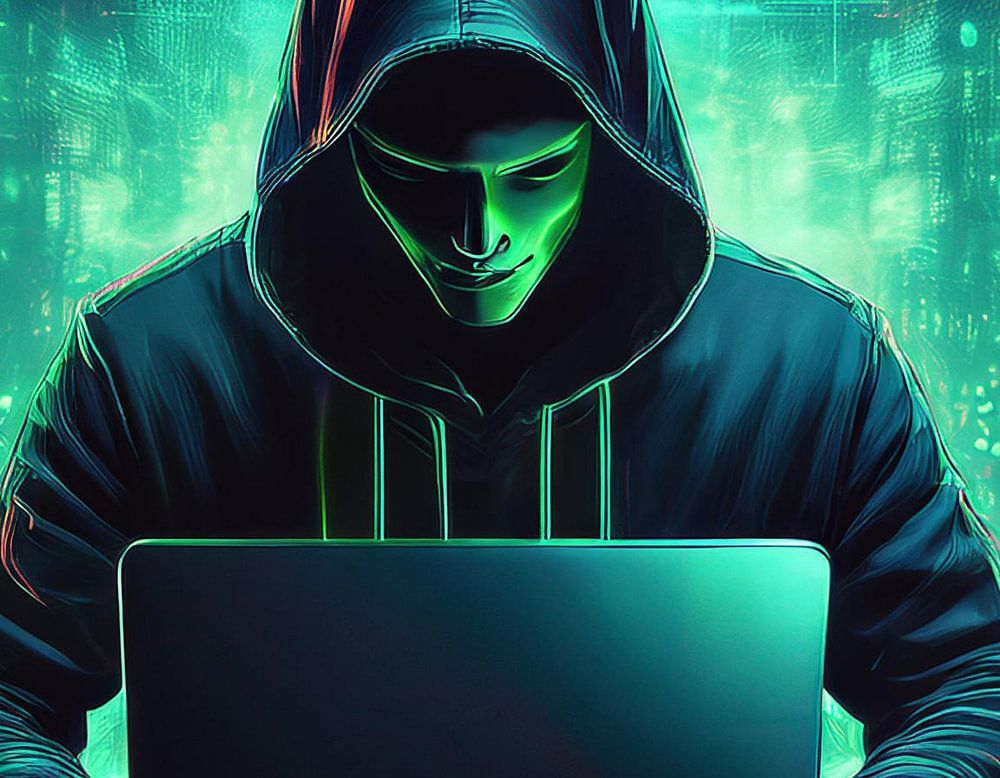 Mann mit Hoodie und Kapuze vor einem Laptop und illuminiertem grünen Hintergrund