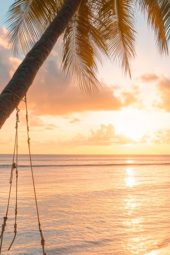 Sanfte Wellen umspielen den goldenen Sand, während eine einsame Schaukel an einem schräg wachsenden Palmenstamm hängt. Das warme Licht der untergehenden Sonne taucht die Szenerie in ein traumhaftes Farbenmeer aus Orange und Blau. Ein Ort, der zum Träumen und Entspannen einlädt, wo die Zeit stillzustehen scheint.