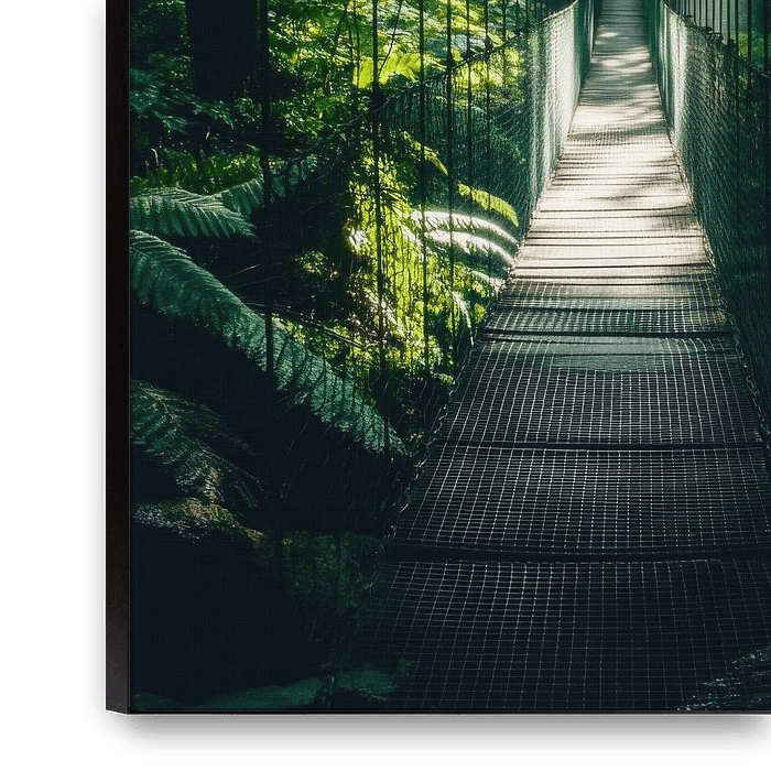 Ein geheimnisvoller Pfad schwebt über dem Waldboden, umrahmt von üppigem Grün und gesprenkeltem Licht, das durch die Baumkronen bricht. Der schmale Steg zieht den Blick in die Ferne, wo das Licht eine fast magische Aura schafft. Hier vereinen sich Natur und Abenteuer, während die sanfte Brise Geschichten aus der Tiefe des Dschungels…
